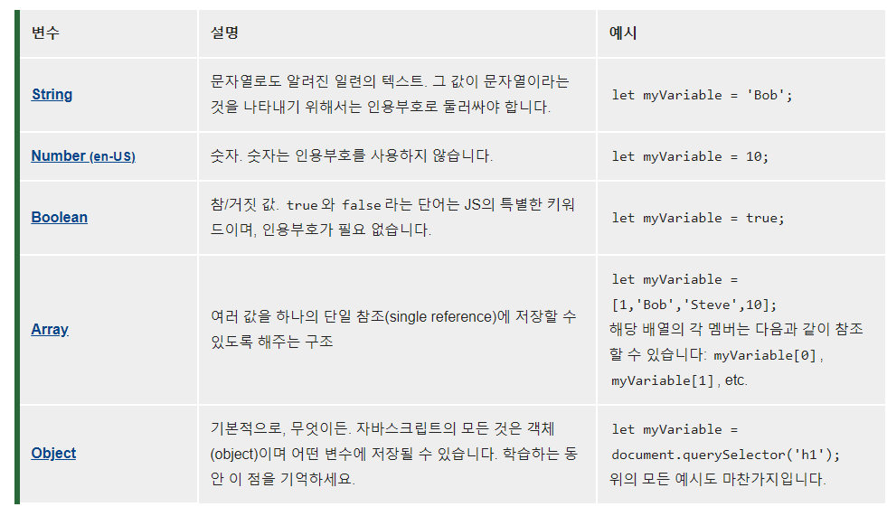 위부터 차례대로 string 문자열의 자료형태이고, 정수를 저장한다거나 Boolean으로 참, 거짓을 다룰 수 있고