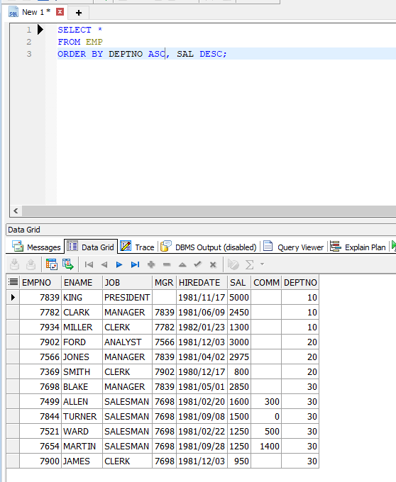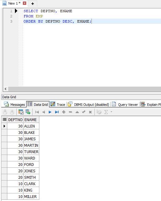 ORDER BY절 첫번째로 명시된 DEPTNO열을 기준으로 오름차순 정렬 후
