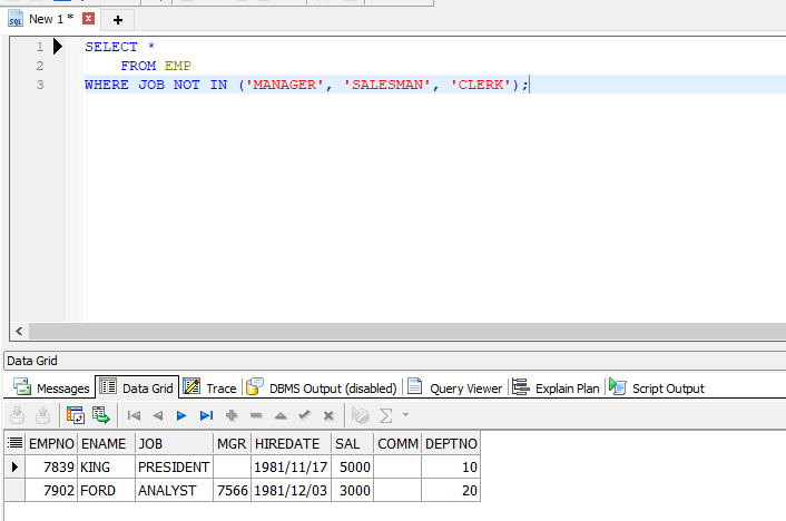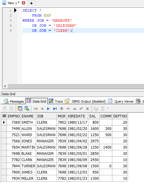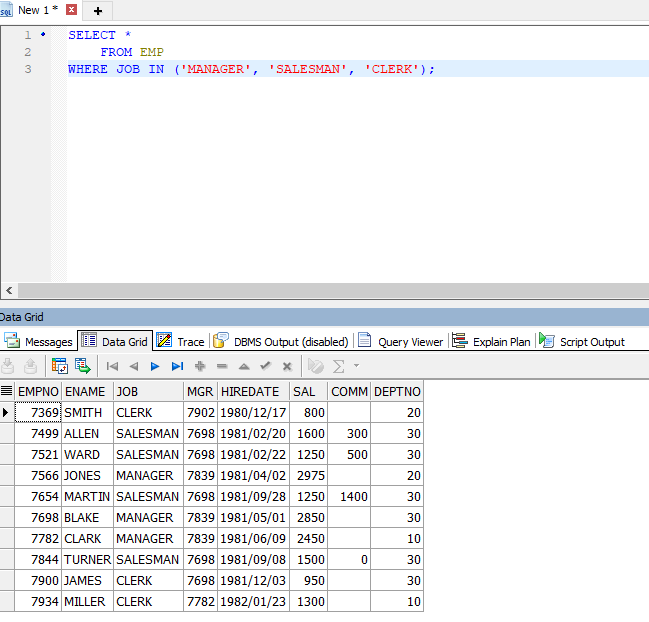 JOB열 값이 MANAGER, SALESMAN, CLERK 중 하나라면 모두 조회한다.