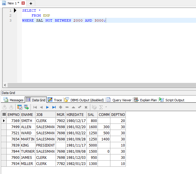 BETWEEN앞에 NOT을 붙이면 2000 ~ 3000 이외 값들이 조회된다.