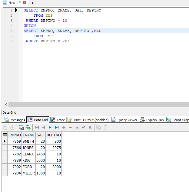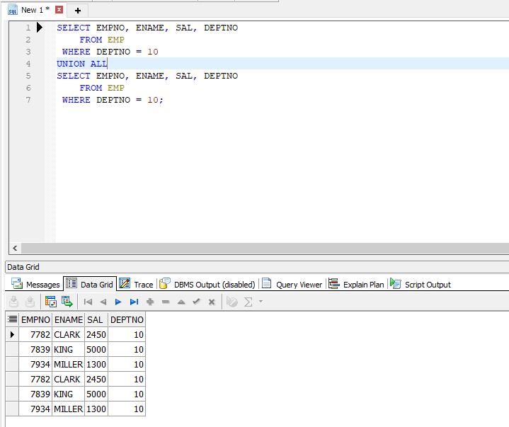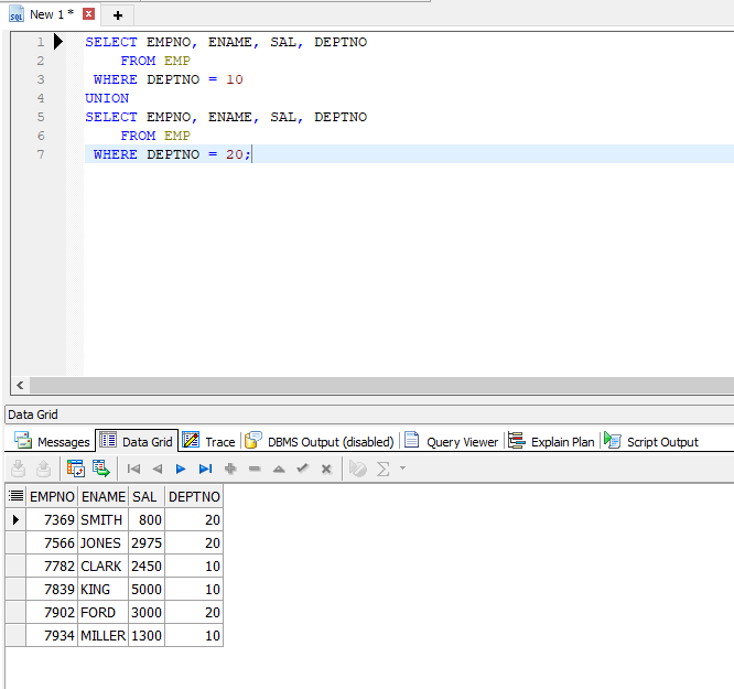 위에 코드를 보면 10번 부서 사원과 20번 부서 사원의 정보가 합쳐져서 출력되었다.