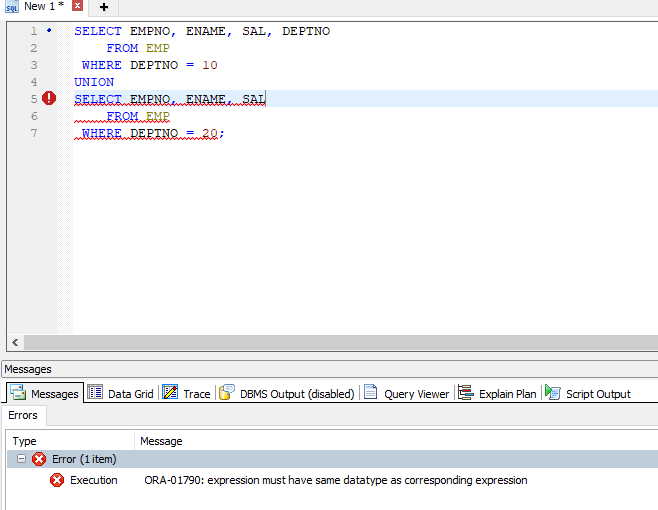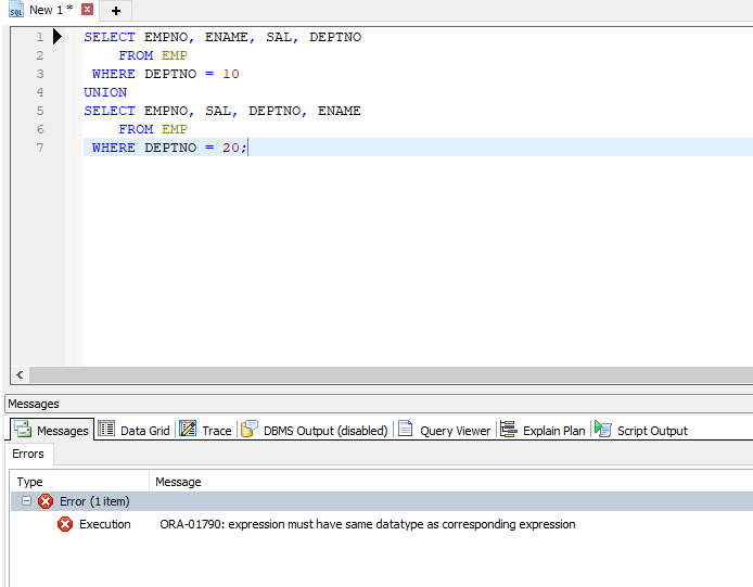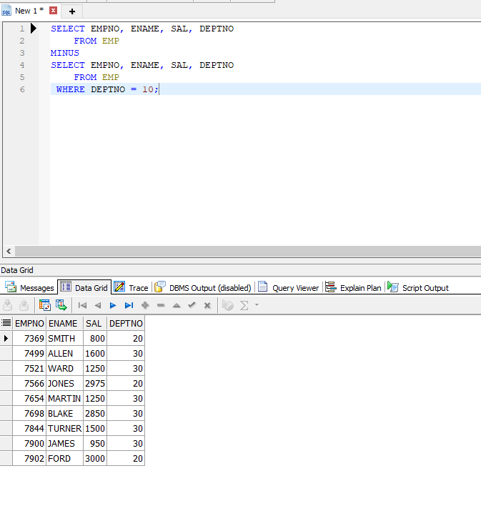 | MINUS | 먼저 작성한 SELECT문의 값에서 다음 SELECT문의 값을 차집합 처리한다. 먼저 작성한 SELECT문의 값 중 다음 SELECT문에 존재하지 않는 데이터만 출력한다. (즉, 데이터 값이 같은 것들은 제외하고 출력한다.) |