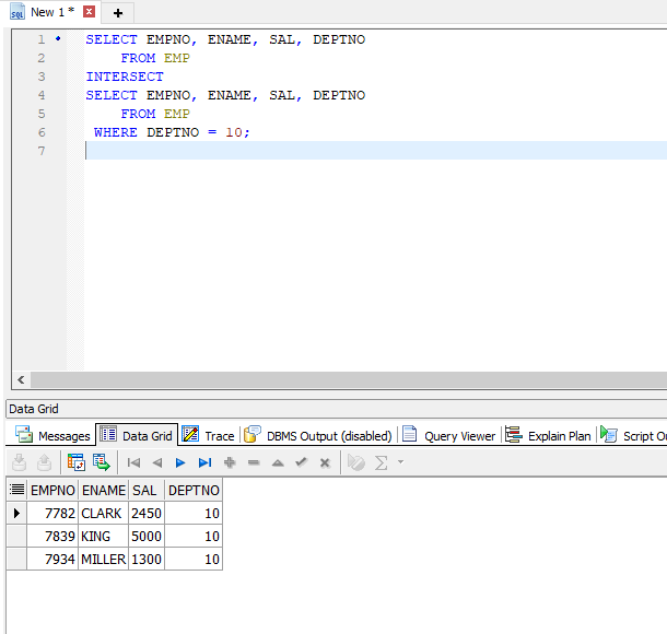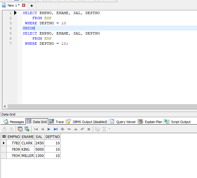 두 SELECT문에서 EMP테이블 DEPTNO열 값이 10인 데이터만 출력된다.